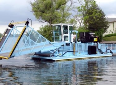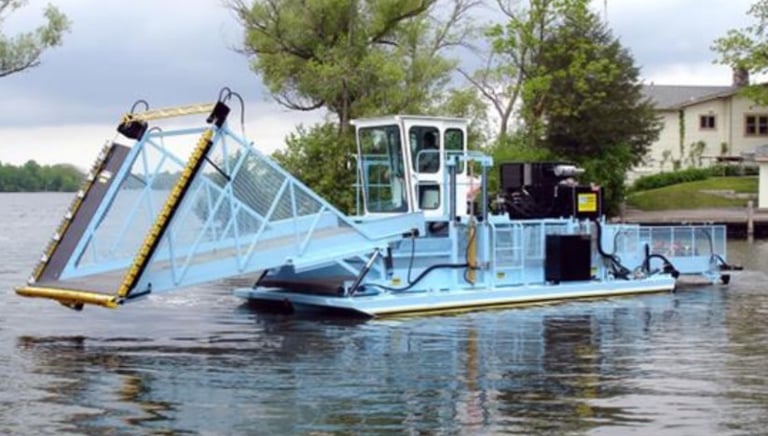 Cortar y recoletar regetación flotante en presas y lagos.